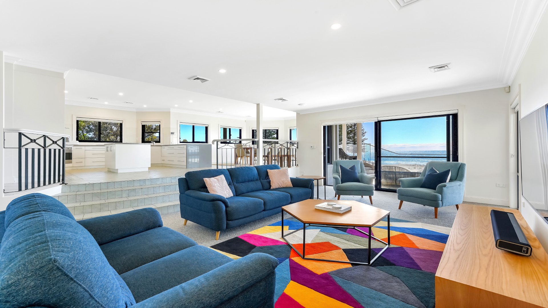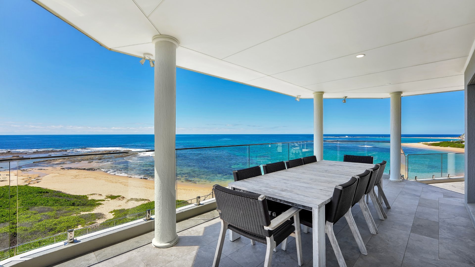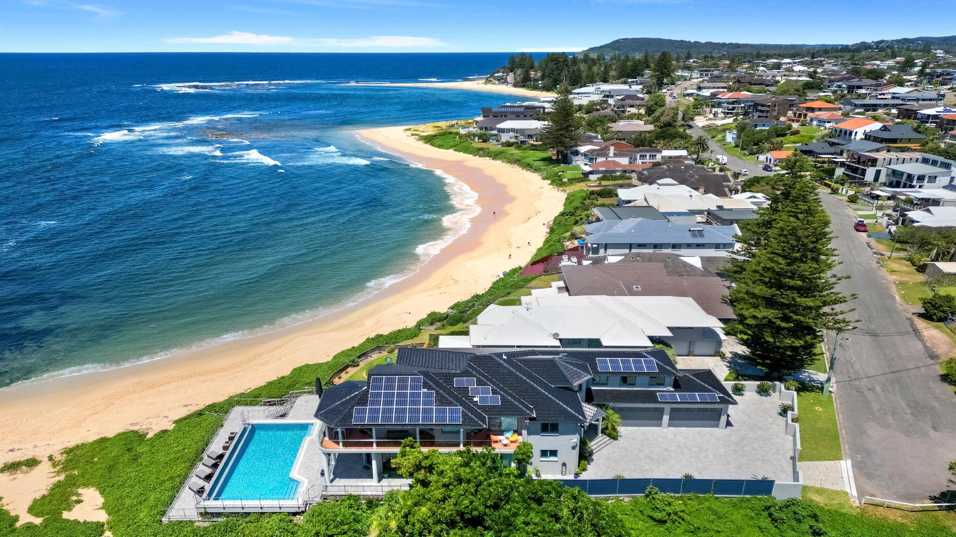 Waves at Blue Bay is the ultimate family getaway. Generous in its proportions, this impeccably styled absolute beachfront is perfectly positioned to enjoy the 180-degree ocean views. Split over two levels Waves at Blue Bay is complemented by a large entertaining deck with BBQ area, private infinity-edge pool overlooking the ocean, and direct access to beautiful Blue Bay beach. Thoughtfully designed, this home features two beautifully appointed kitchens and living spaces on both levels, games room with pool table and foosball, ducted airconditioning upstairs and secure entry. Laze by the pool on a sun lounge, or take in the view from the sitting areas. Waves at Blue Bay is the perfect property to completely relax. Master bedroom contains a king bed, walk-in robe and en suite with corner bath. Bedroom 2 contains a king split, bedroom 3 contains a king and kids single. Bedroom 4 contains a king split, while bedroom 5 contains a king bed and ocean views. Bedroom 6 contains two bunk beds. All bedrooms except bedroom 6 feature ceiling fans and built-ins.