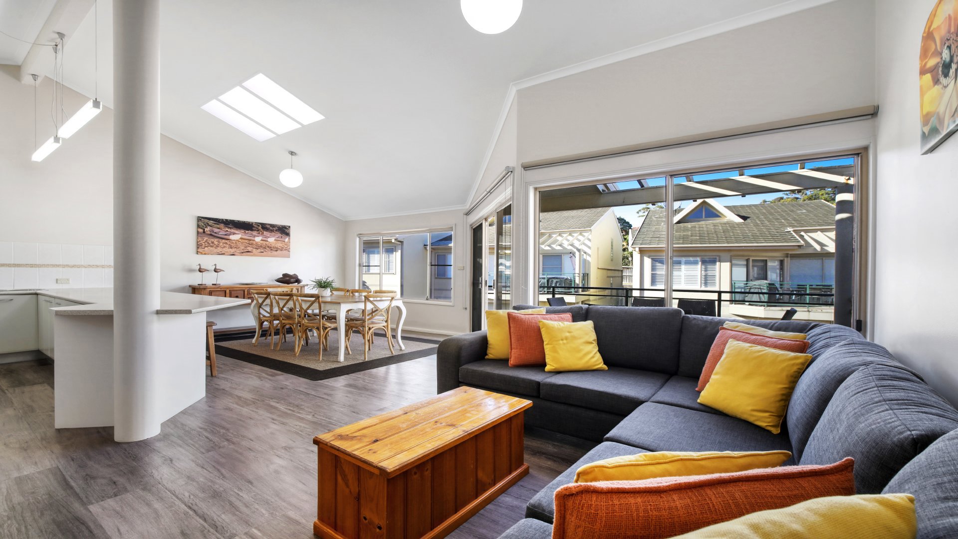 Watermark #17 forms part of a secure complex in Terrigal. This spacious split-level townhouse is a 10-minute walk to Terrigal beach and esplanade. The ideal choice for families, this apartment boasts a huge courtyard area for entertaining, ample indoor/outdoor living spaces and shared swimming pool and playground in the complex. Air conditioning makes Watermark #17 the perfect choice in the summer, and its sun-filled interiors keep it warm in the cooler months. Close to everything but yet far removed from noise, Watermark #17 is modern, comfortable and refreshing. Master bedroom contains a queen bed, walk-in robe and ensuite with shower. Bedroom 2 contains a queen bed with built-in robe, while bedroom 3 contains two single beds and built-in robe. Wi-Fi not included.