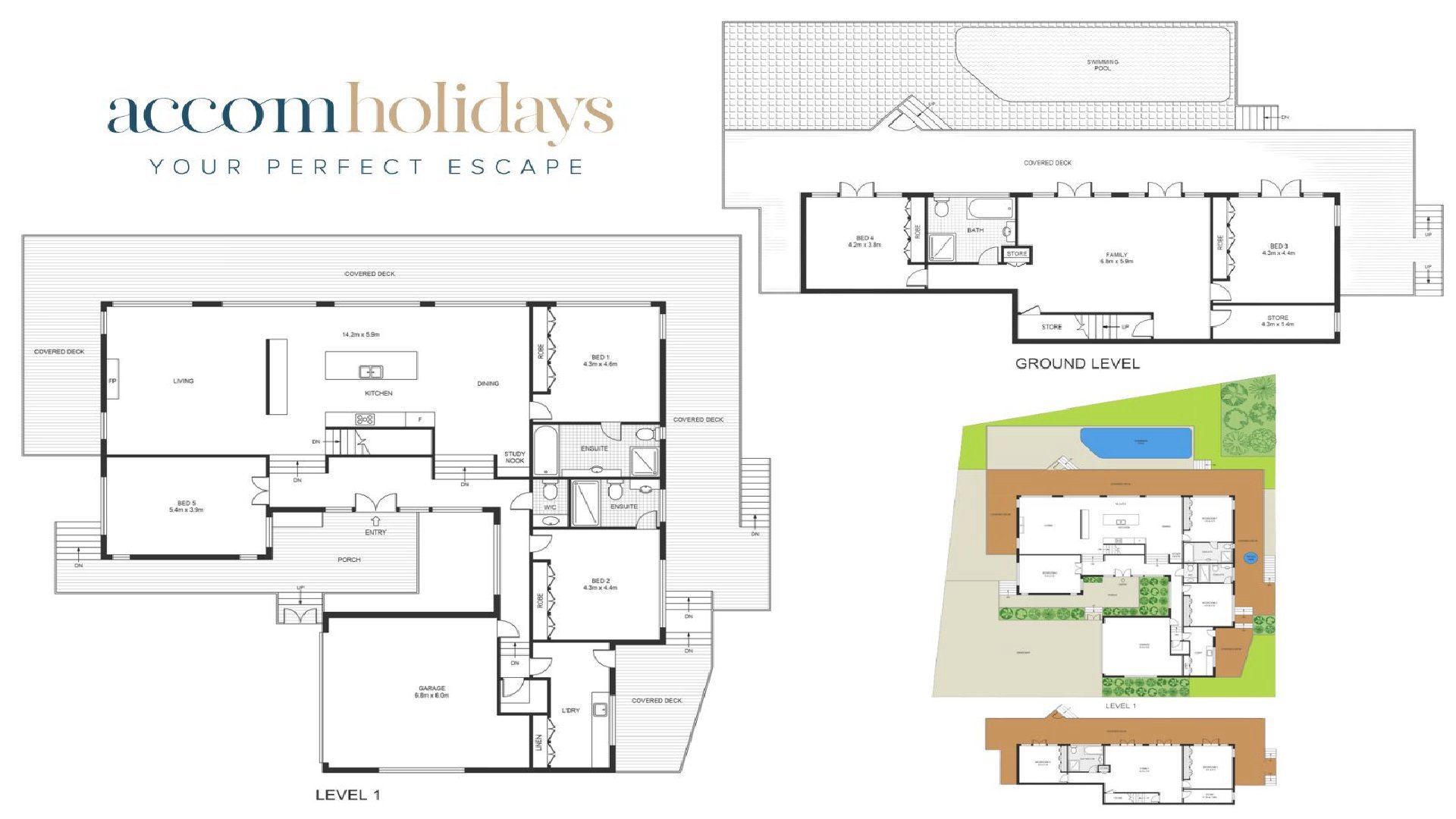 Bedroom 4 features a queen bed while bedroom 5 features two king singles.