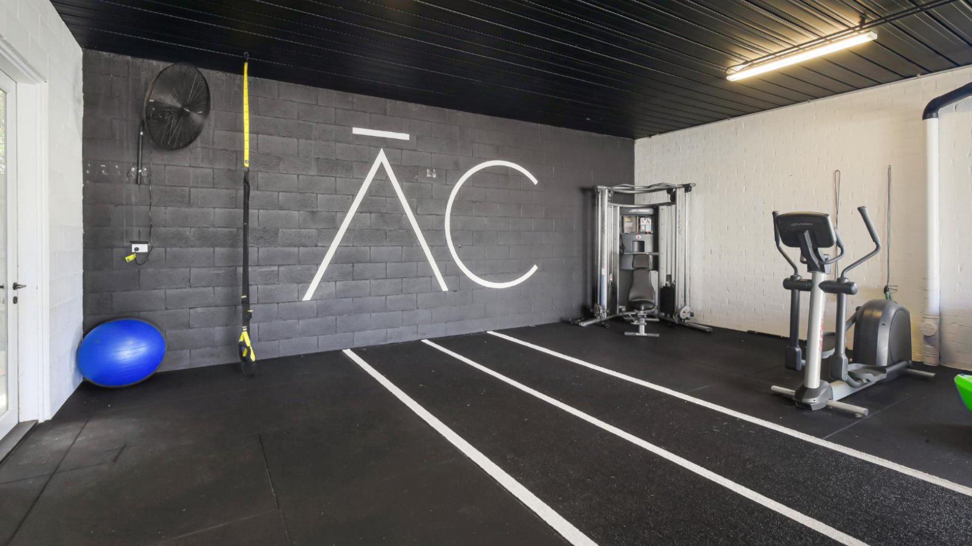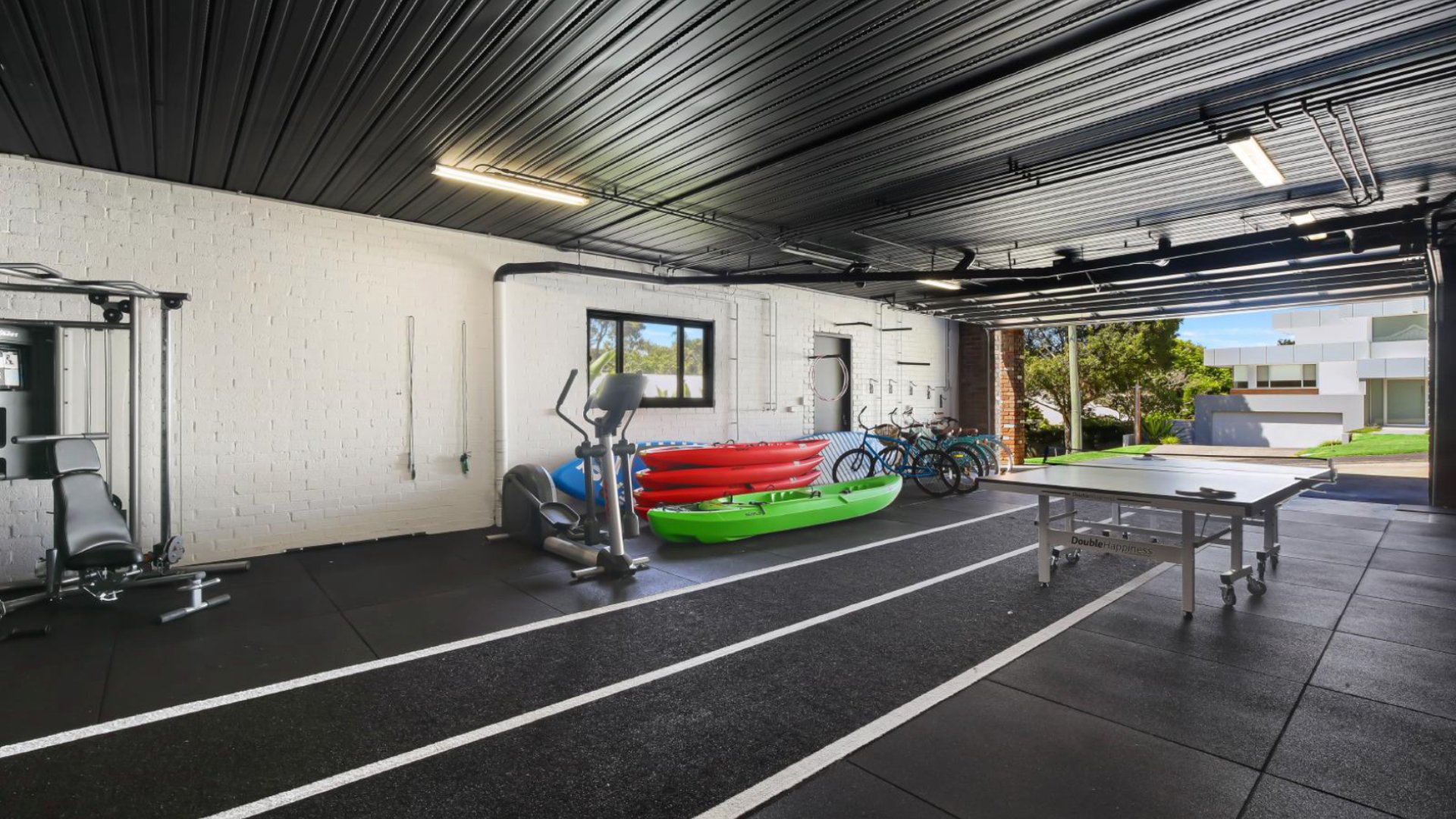 - Private gym studio. Ample space for storing bikes and surfboards.