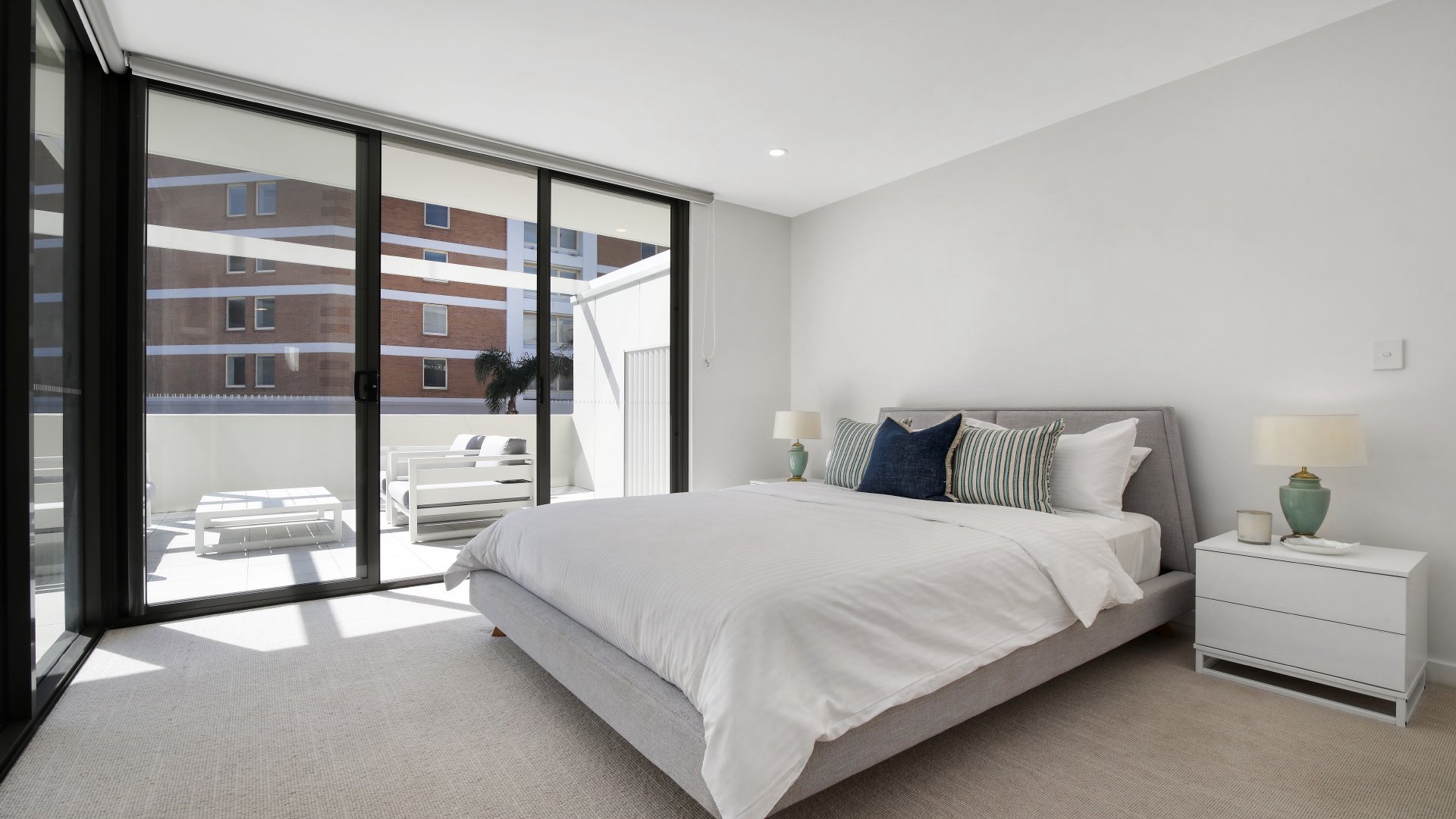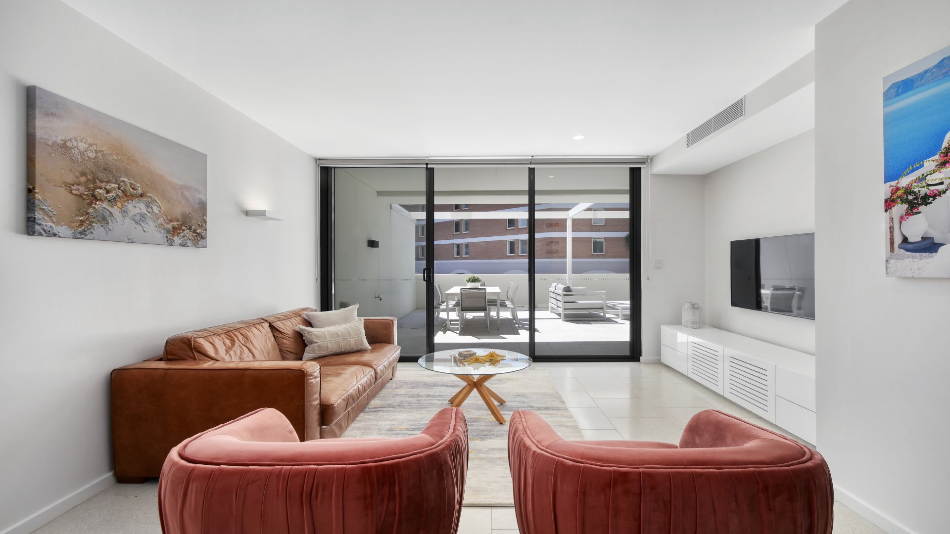 - Open plan living with dining for four; sunny north-facing balcony, seating for six + outdoor lounge