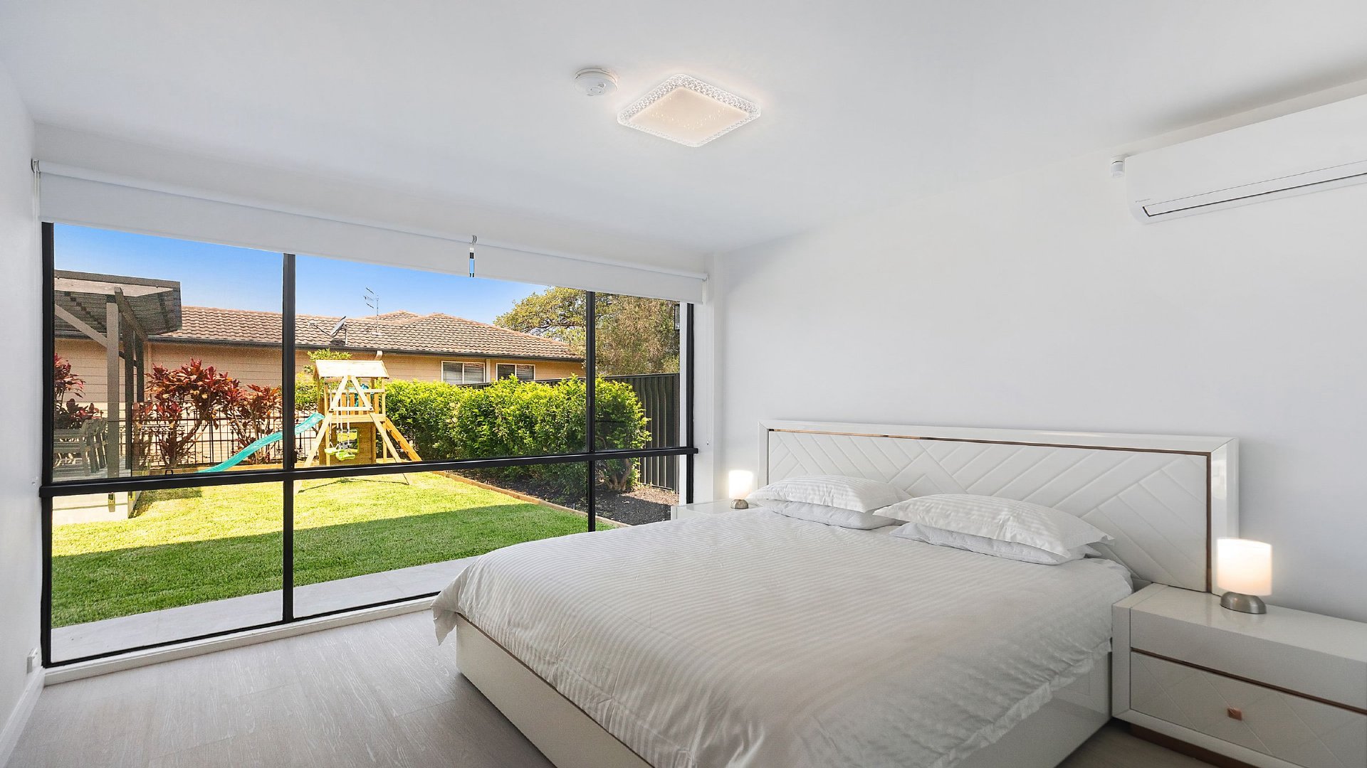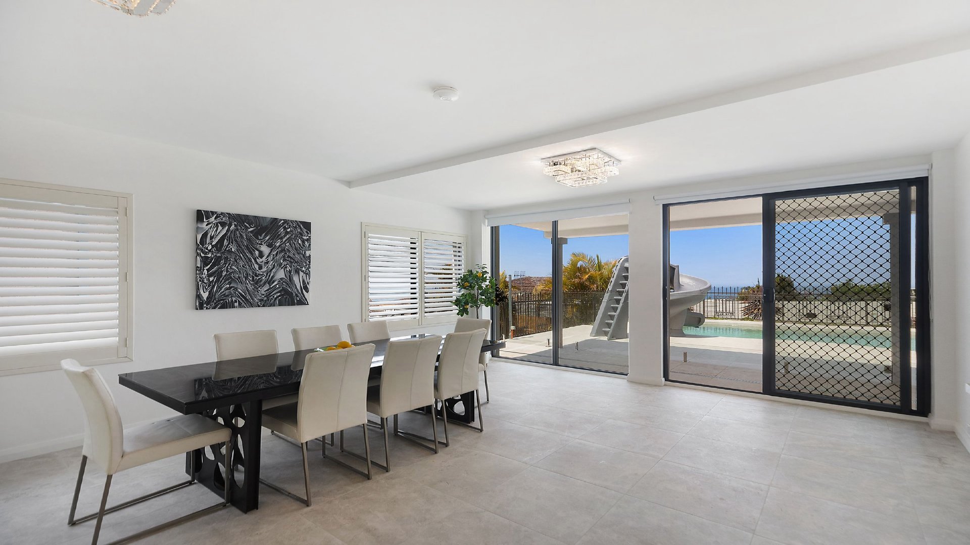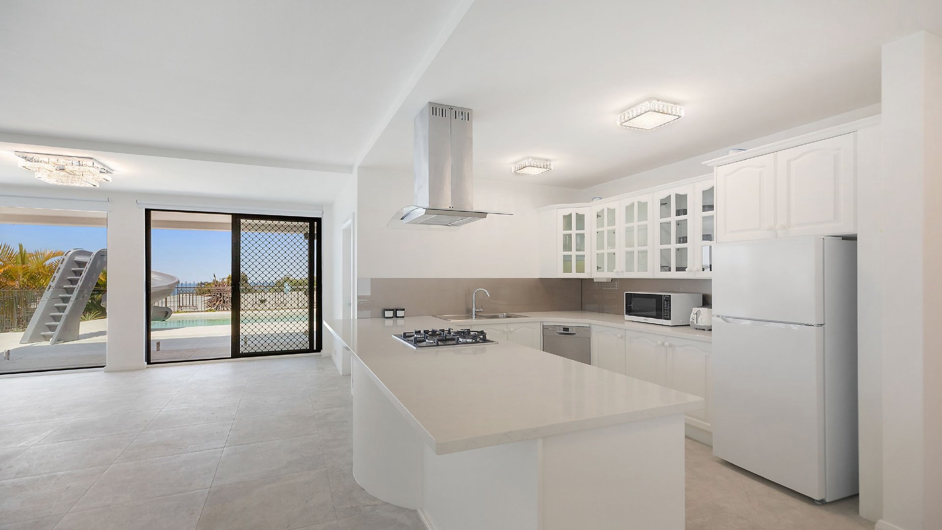 - Kitchen with cooktop and convection microwave oven, dishwasher and cooking utensils Two bathrooms; internal laundry with washing machine and dryer Outdoor entertaining area, BBQ, pool with large waterslide Off street parking for two cars; outdoor play equipment for kids