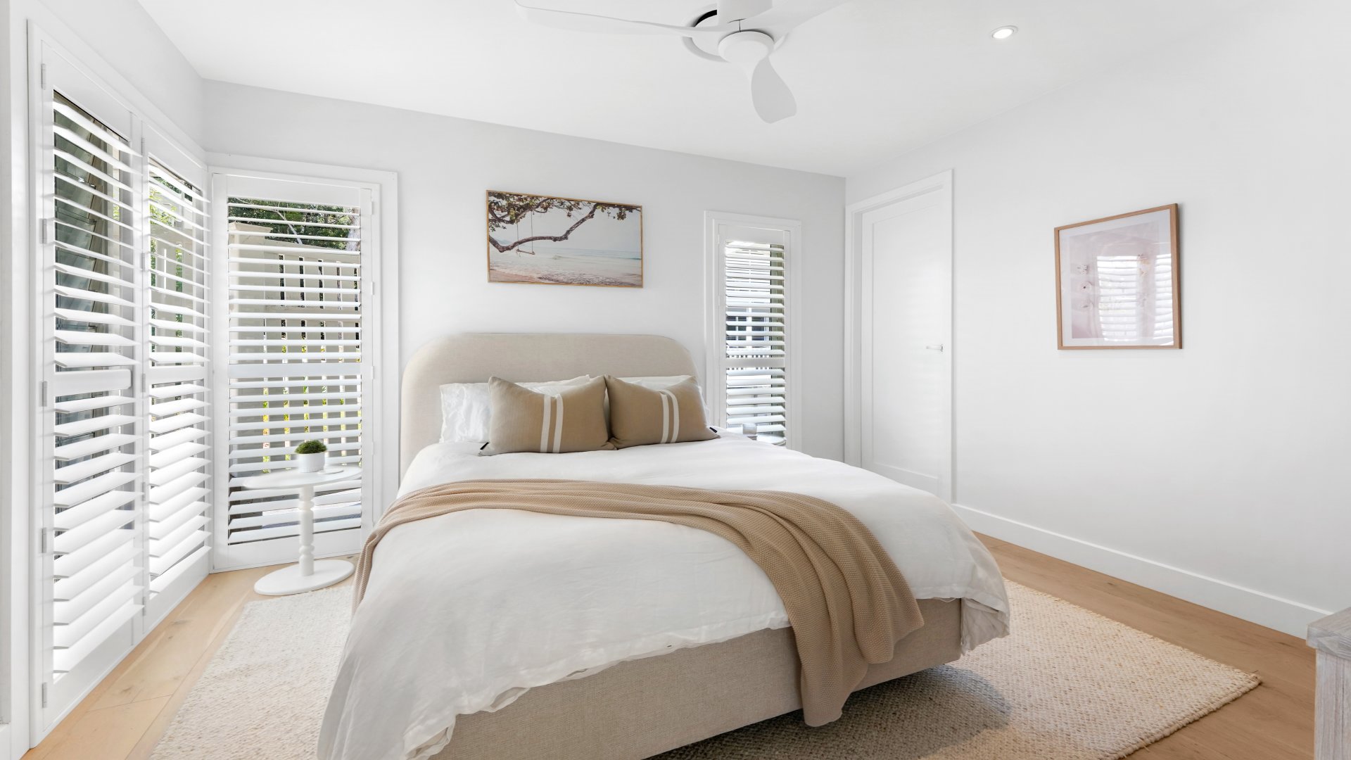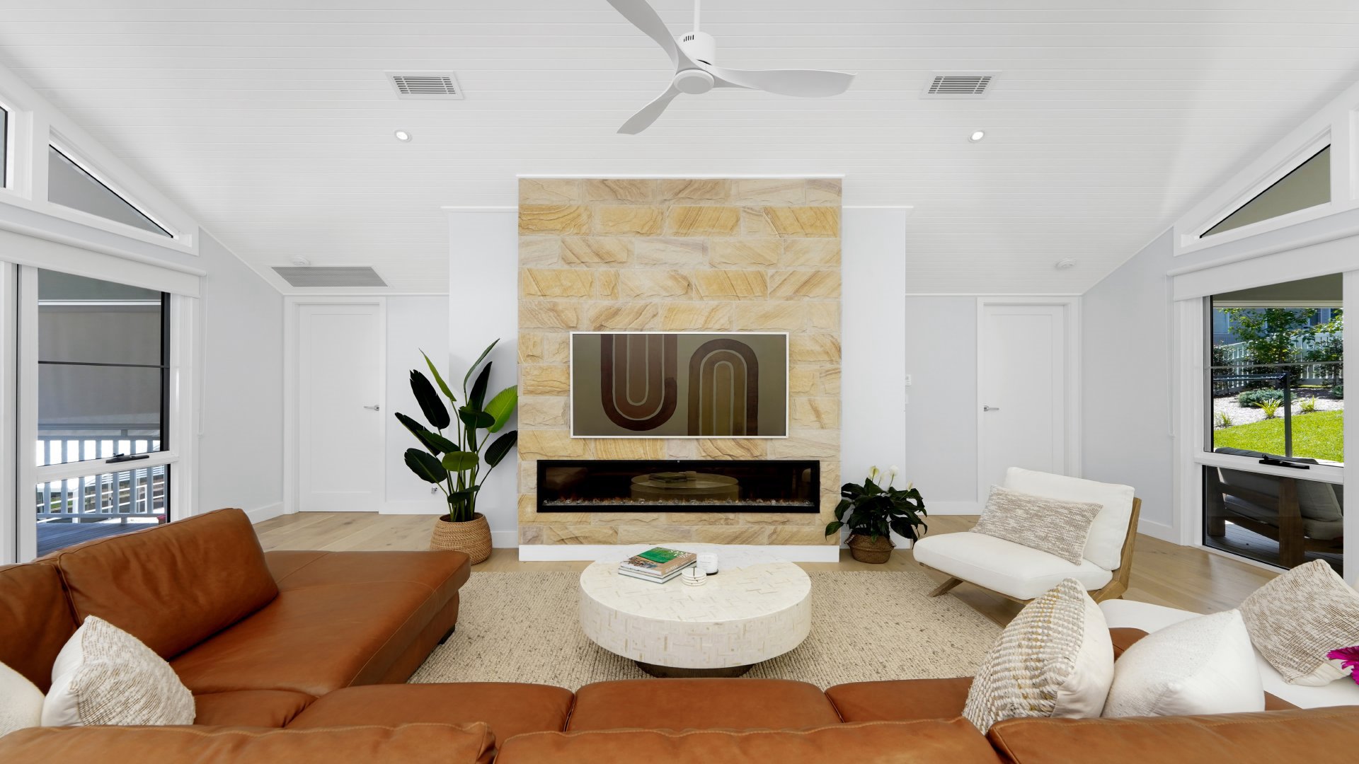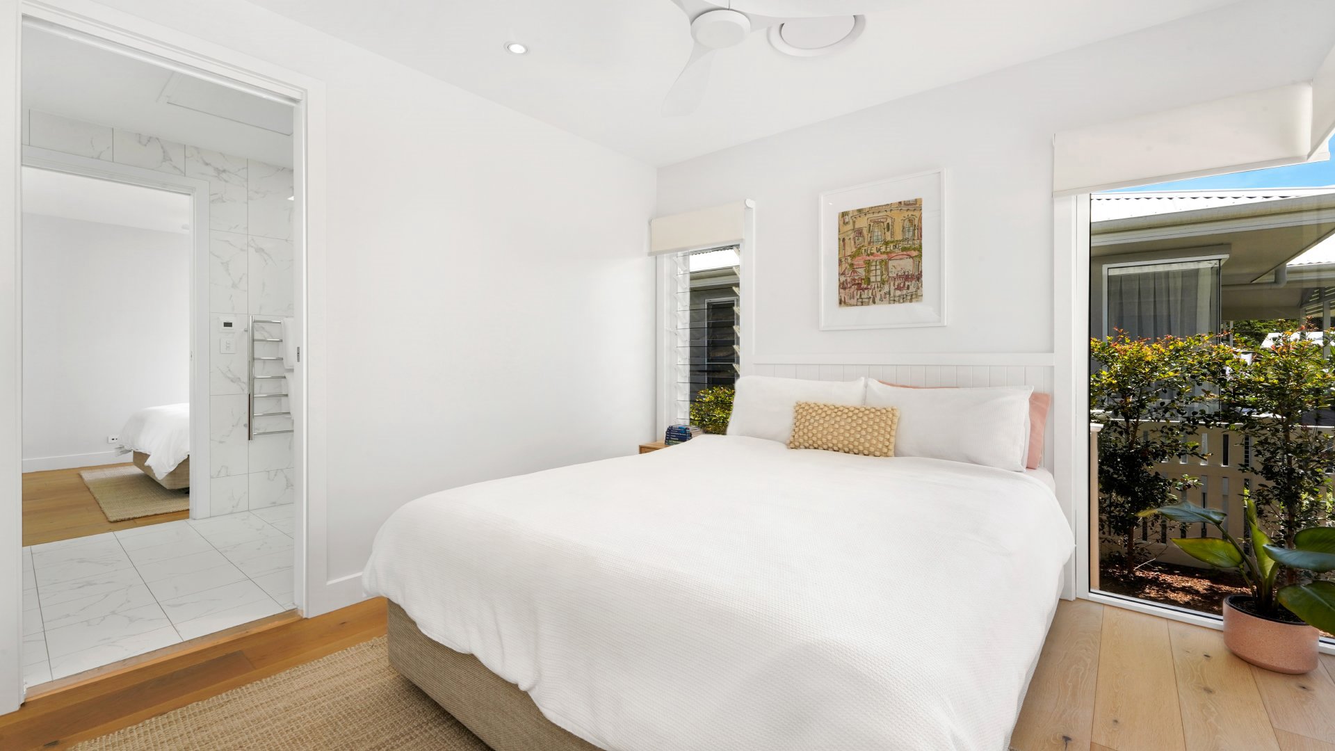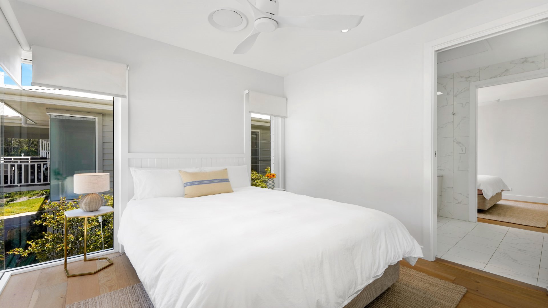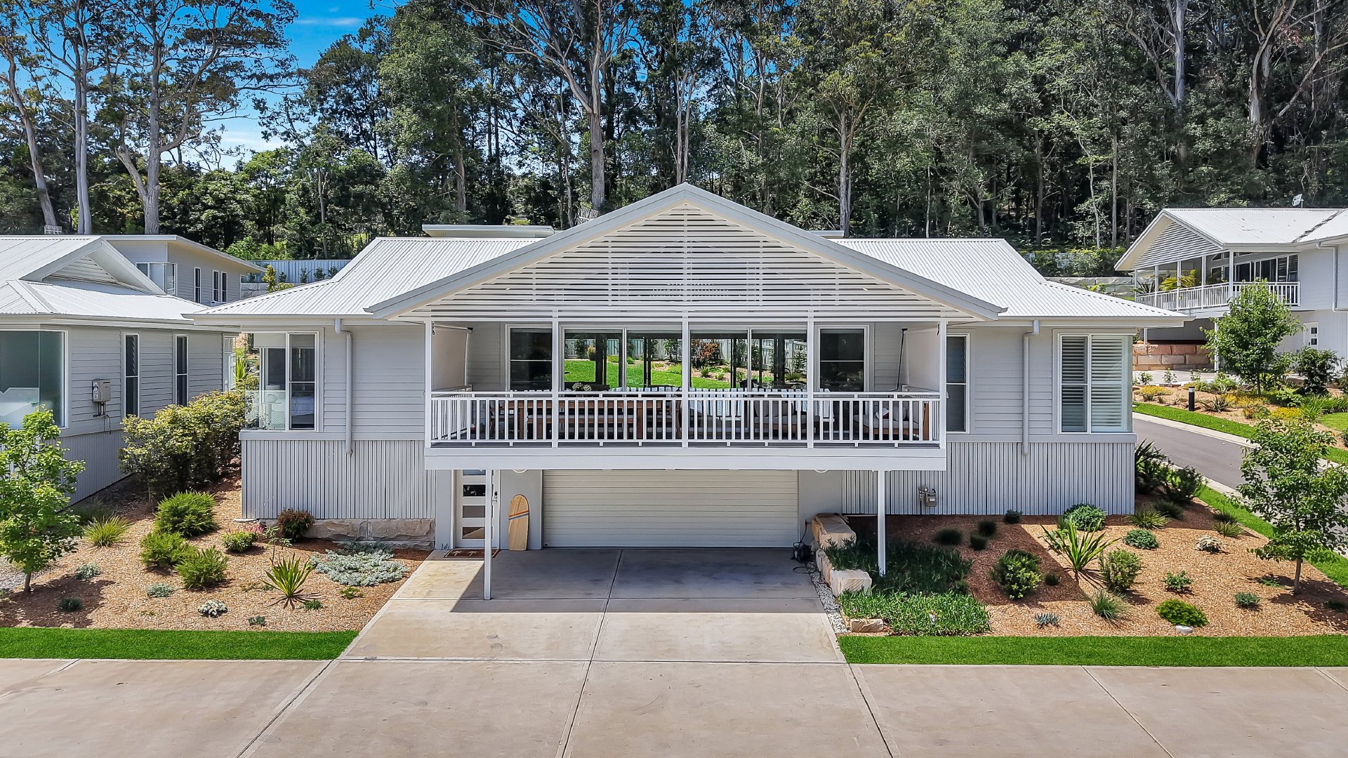 The bright and breezy open plan kitchen, living and dining area flows out to both front and back covered entertaining areas. Inside is complete with three bedrooms, the main bedroom contains a queen bed, large ensuite, ceiling fan and ducted aircon. Bedroom two and three have queen beds, ceiling fans, ducted aircon and a shared ensuite bathroom.