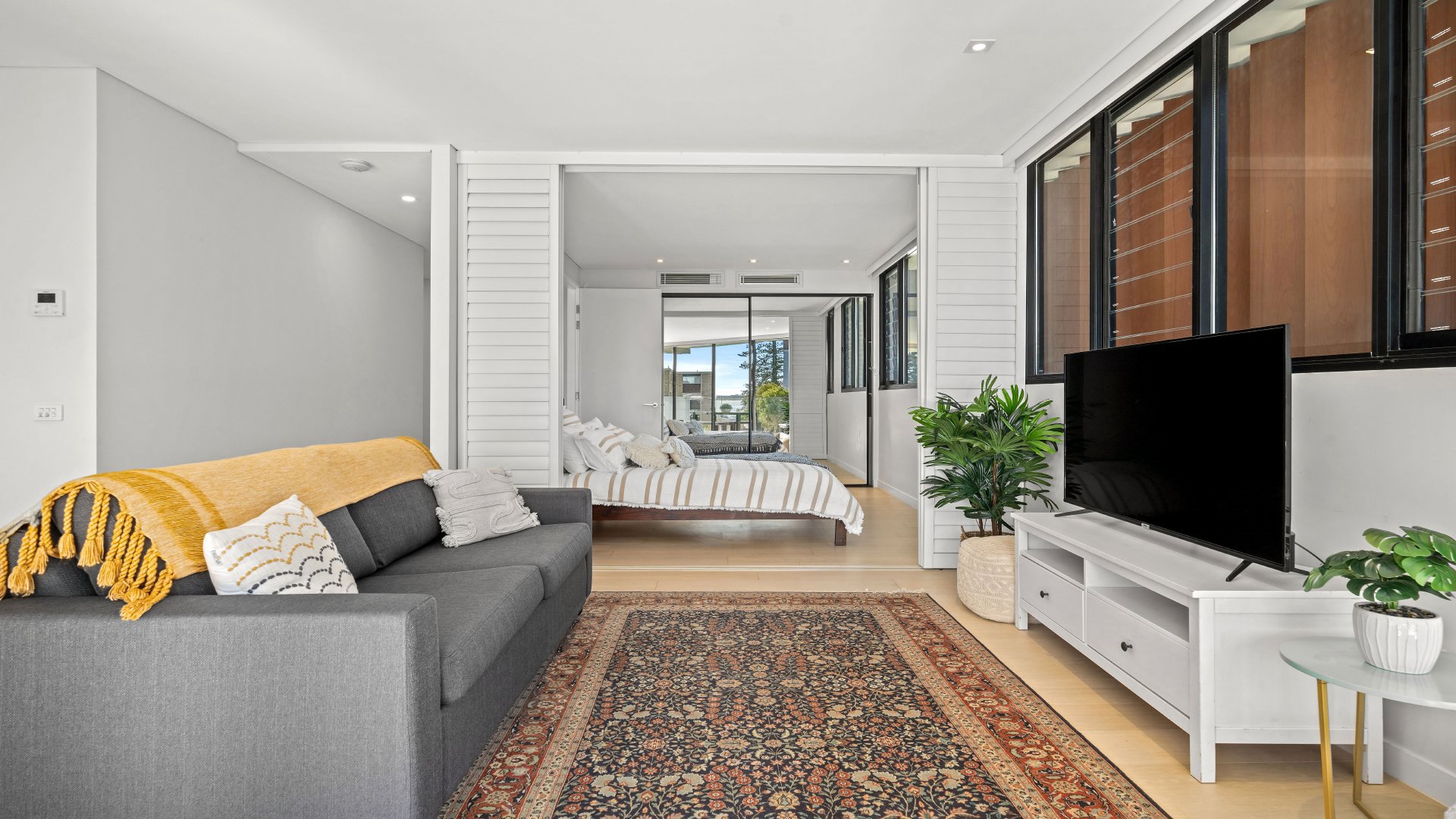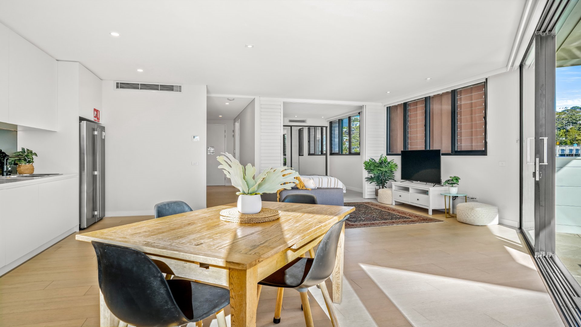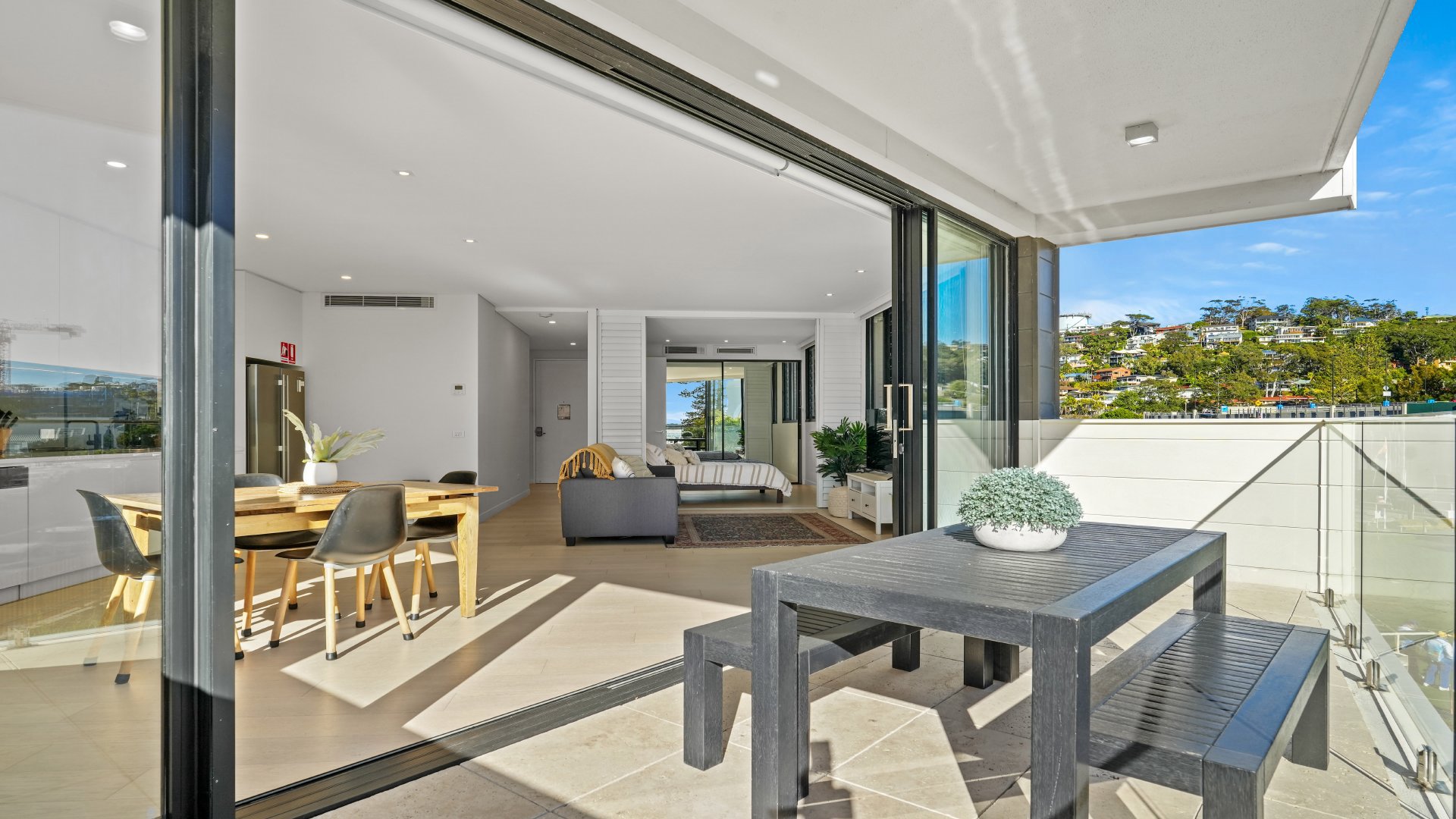 - Naturally light-filled, open-plan living area flows to large, covered balcony