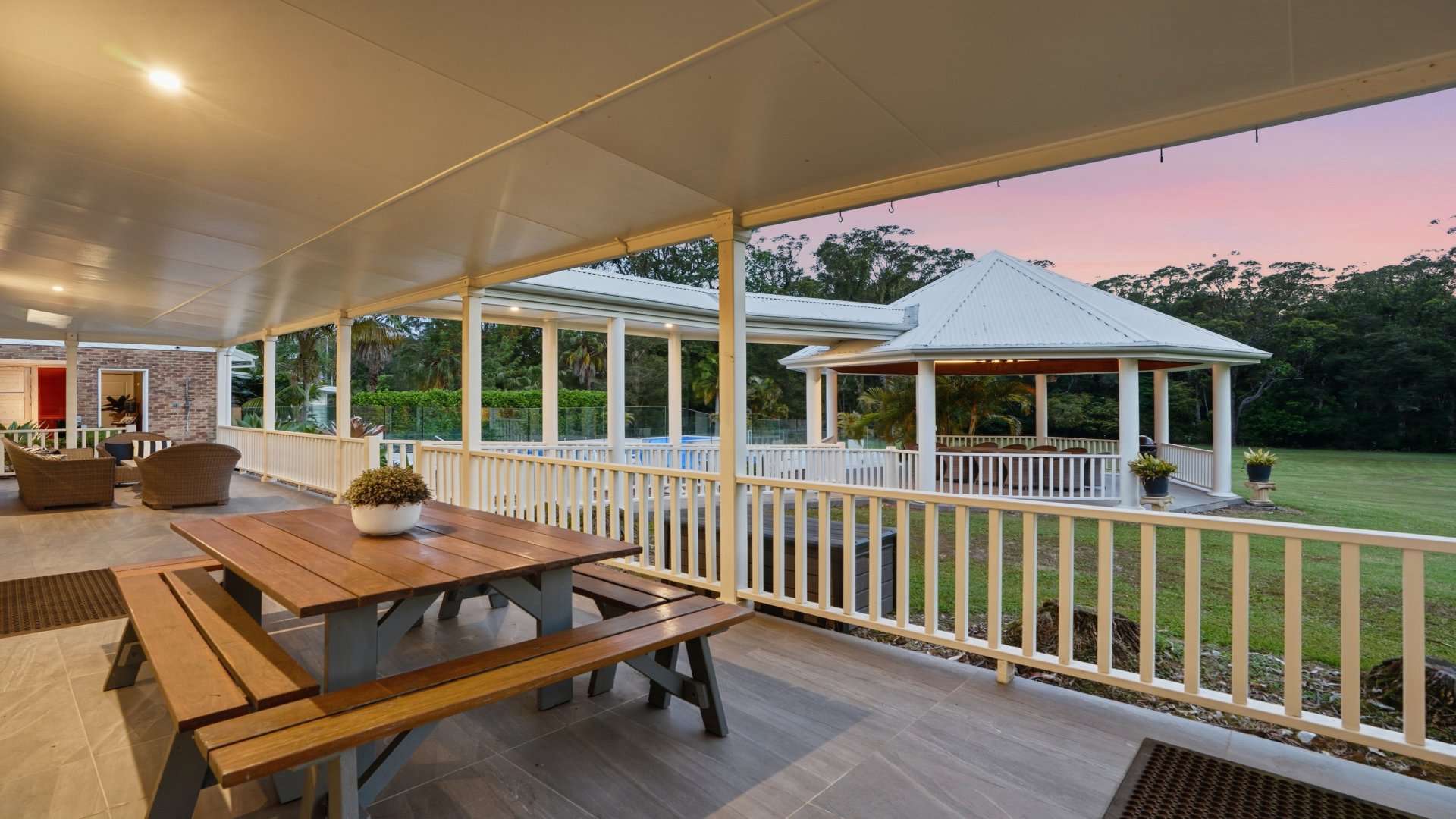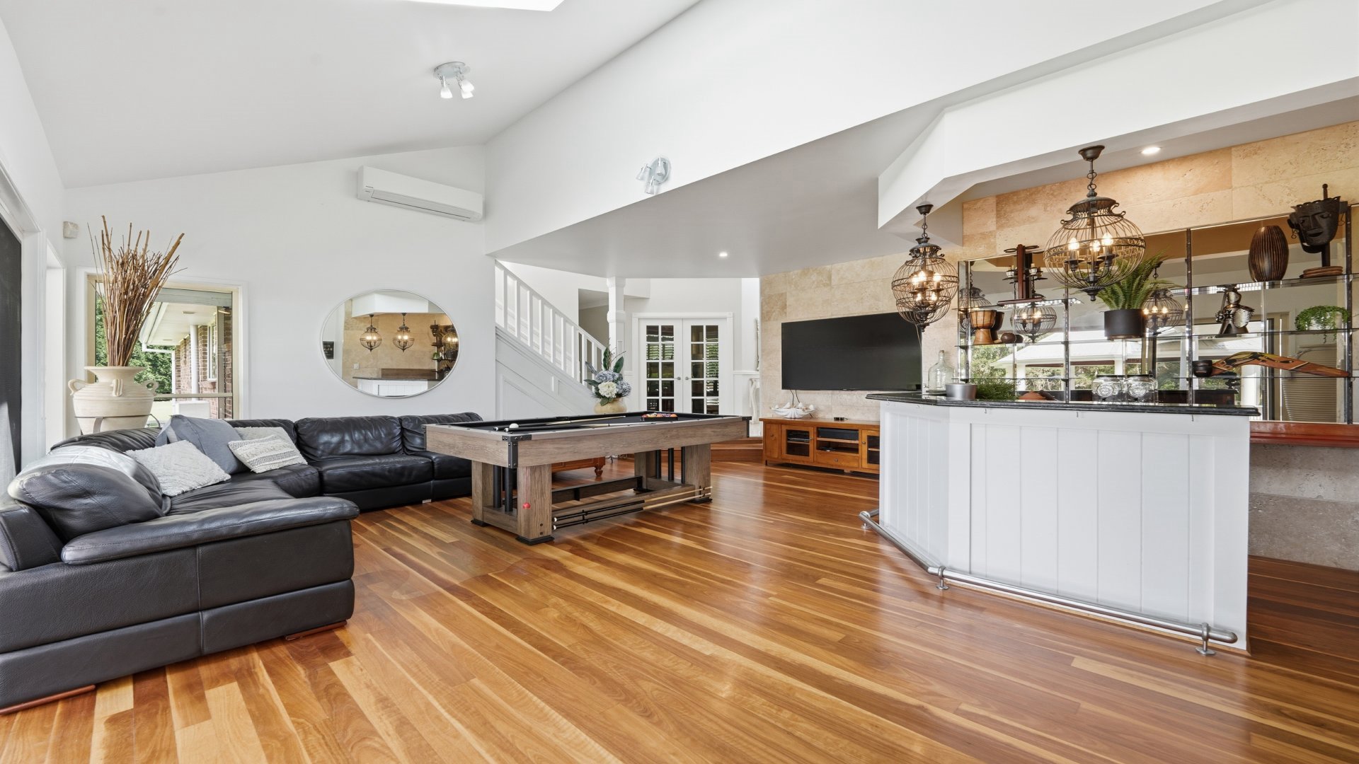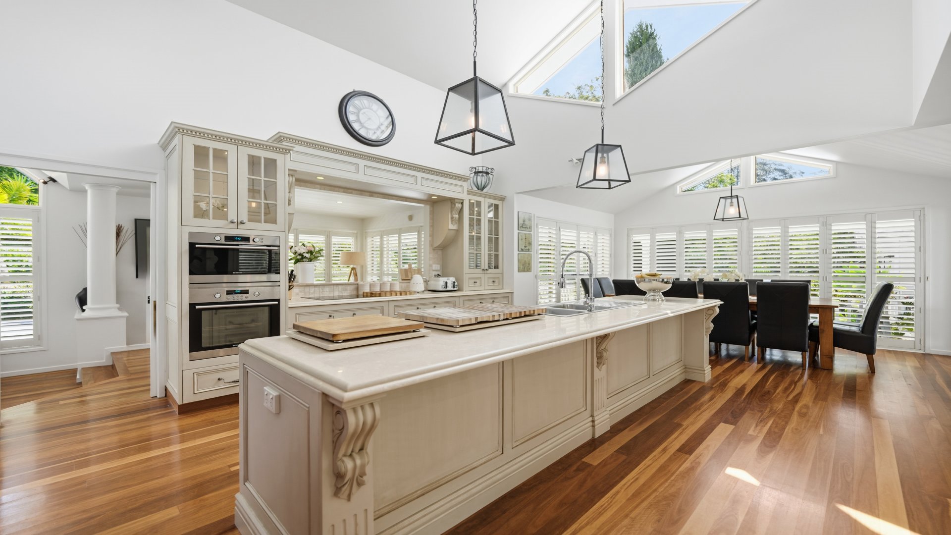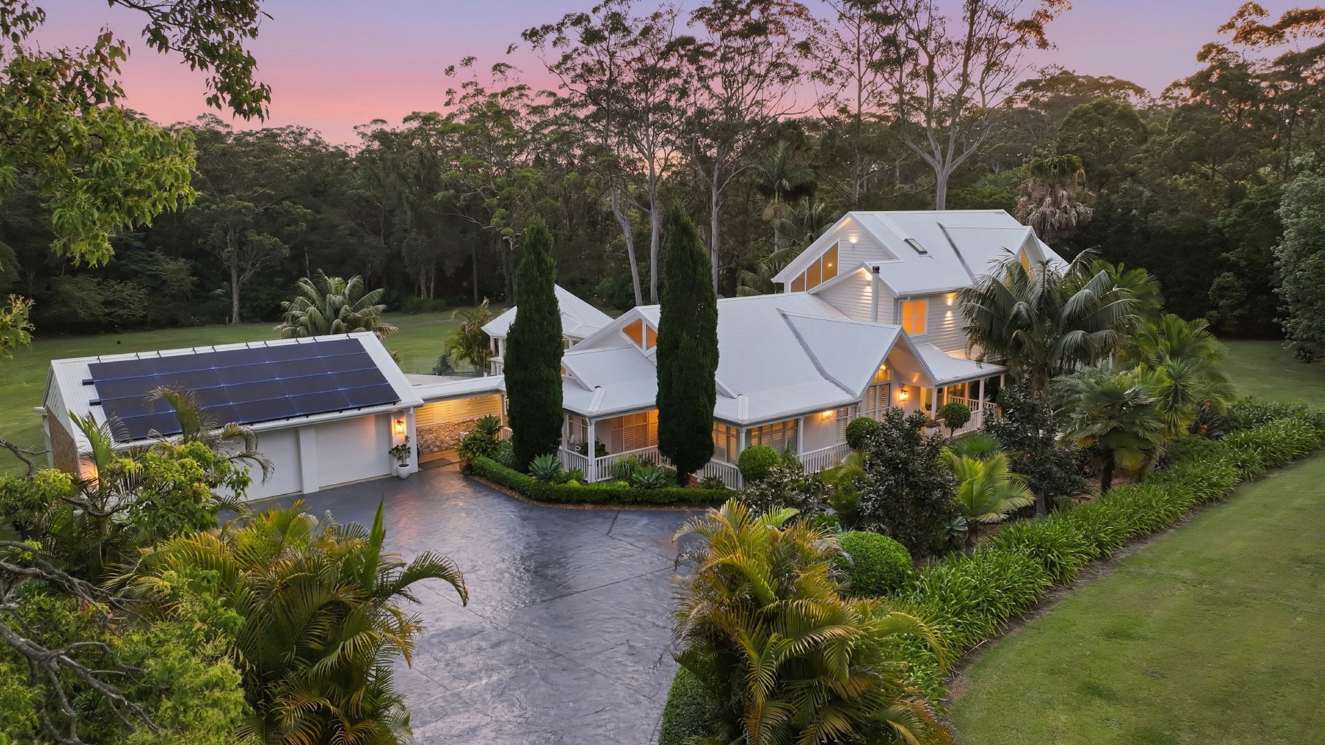 Wake up to the sound of bellbirds, spot wallabies graze nearby and watch the colourful kookaburras, cockatoos and rosellas from your wide wraparound verandah. Inside, the home features six bedrooms, four bathrooms, and generous open-plan living areas with cathedral ceilings and skylights that fill the space with natural light. The French Provincial kitchen, indoor bar and multiple entertaining zones make hosting effortless, while a cosy fireplace and air conditioning provide comfort year-round.