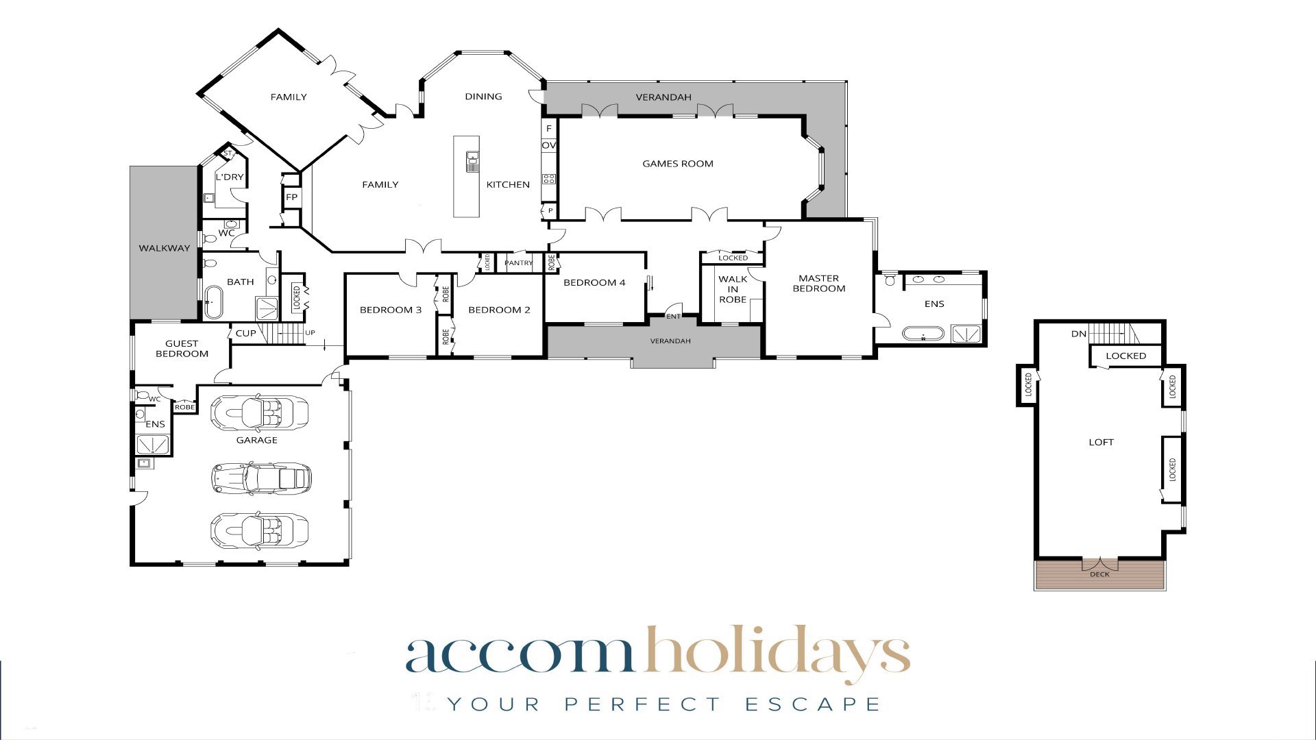 The home offers five generous bedrooms plus a sixth bed in the upstairs loft. The master bedroom features a king bed with ensuite and walk-in robe. Bedrooms two and three each have a queen bed and built-in wardrobes, bedroom four offers two single beds with built-in wardrobe, and the guest bedroom includes a queen bed with ensuite and wardrobe. The loft also features a queen bed.